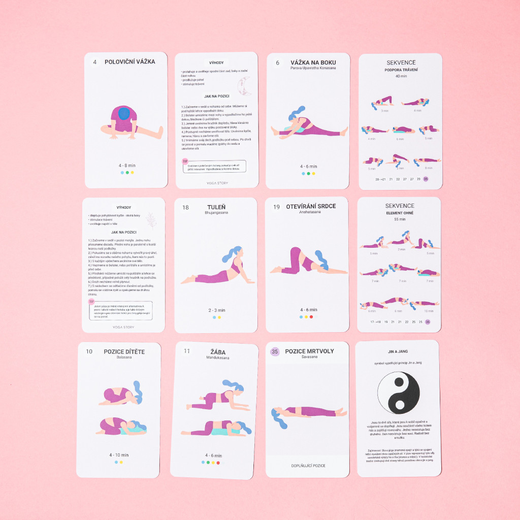 V balíčku najdete malé umělecké dílo. 43 nádherně ilustrovaných karet, které vám pomohou protáhnout všechny svaly těla. Pozice jsou rozdělené do 8 kategorií. Díky nim snadněji najdete požadovanou kartu i vytvoříte vlastní vyváženou sestavu.